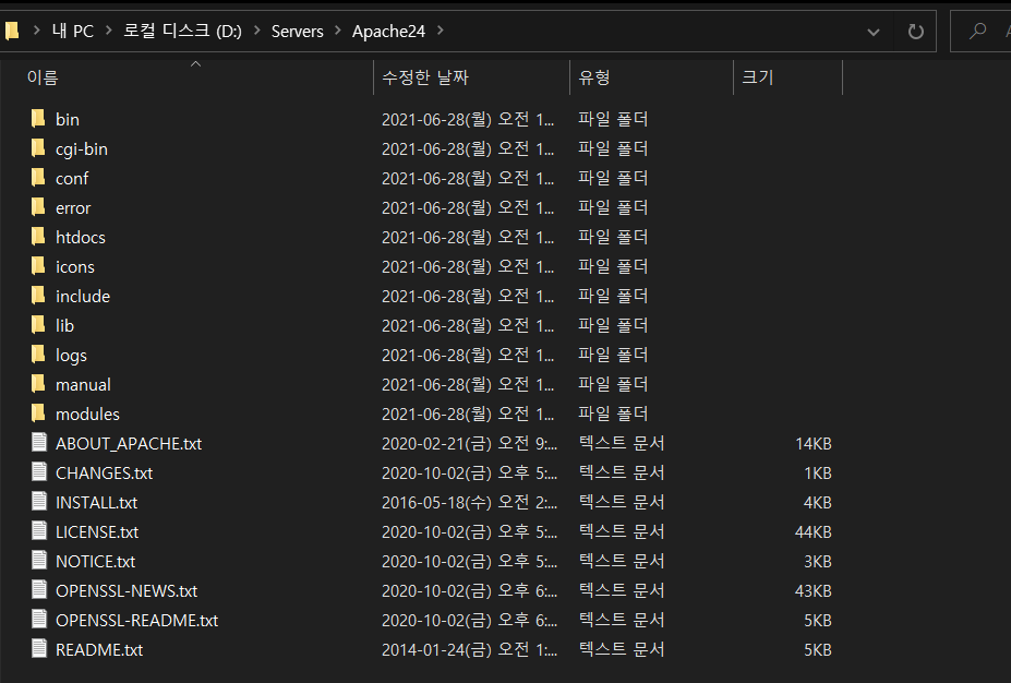 • D:/Servers/Apache24/conf/httpd.conf -> 텍스트 편집기로 열기