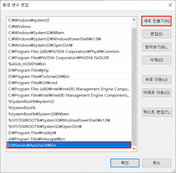 STEP 5) 설정을 마쳤으면 윈도우 시스템 환경 변수의 시스템 변수  path 에 apache 서버 실행파일 경로를 추가합니다.