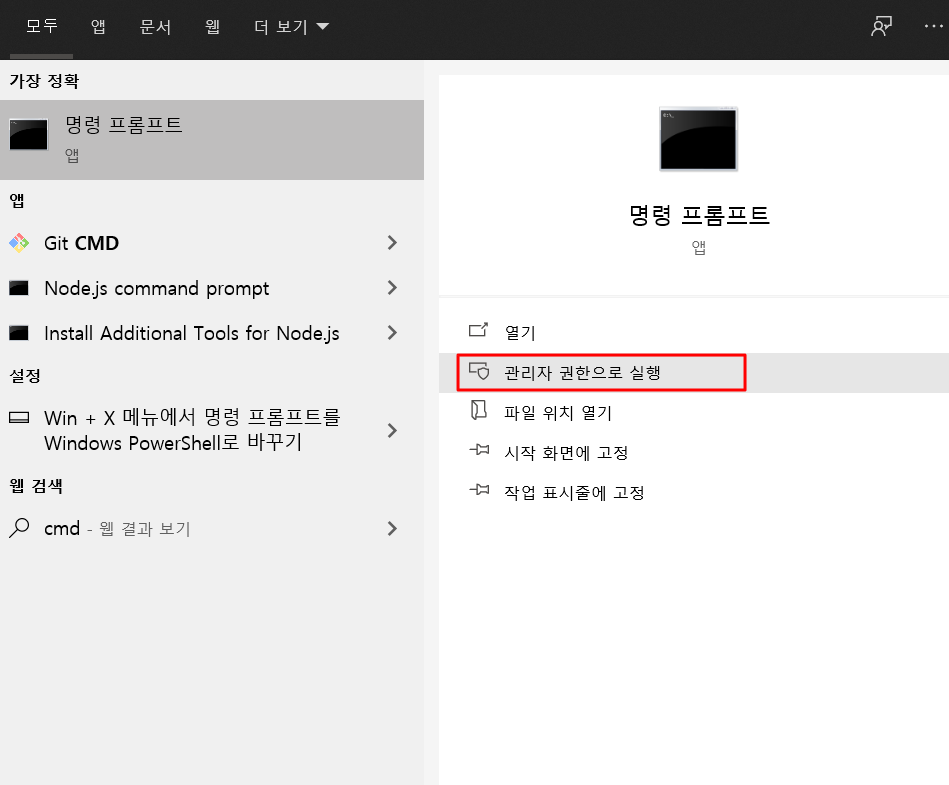 • 관리자 권한으로 cmd창 열기
