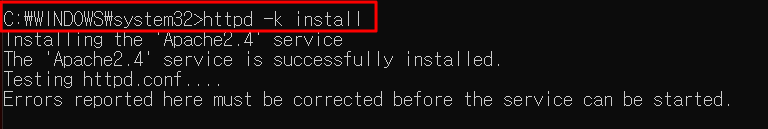 (!) 시스템 변수 path에 apache 실행파일 경로를 등록하지 않은 경우 해당 폴더로 이동하여 명령어를 실행해야 합니다.
