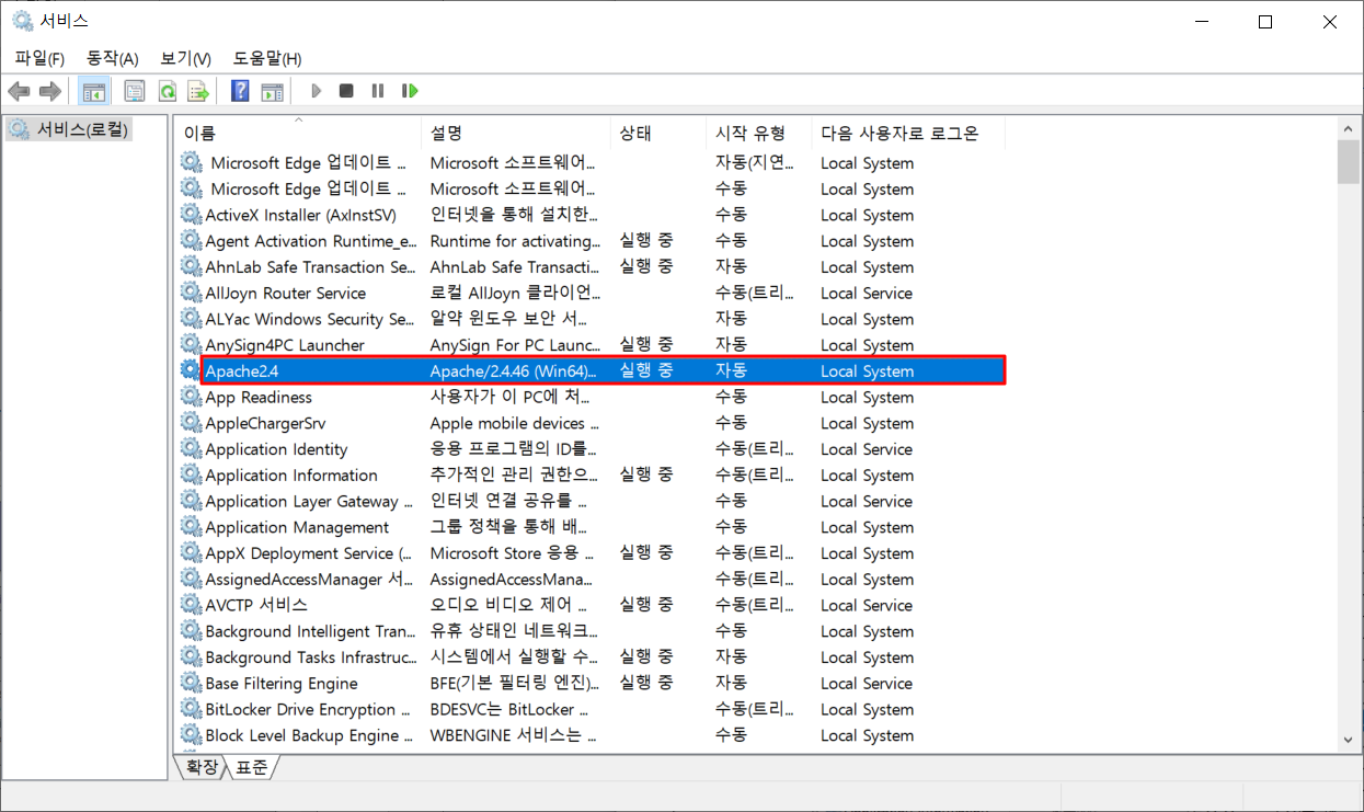 • 윈도우 검색창에 '서비스' 를 검색 및 실행하여 서비스 등록 확인