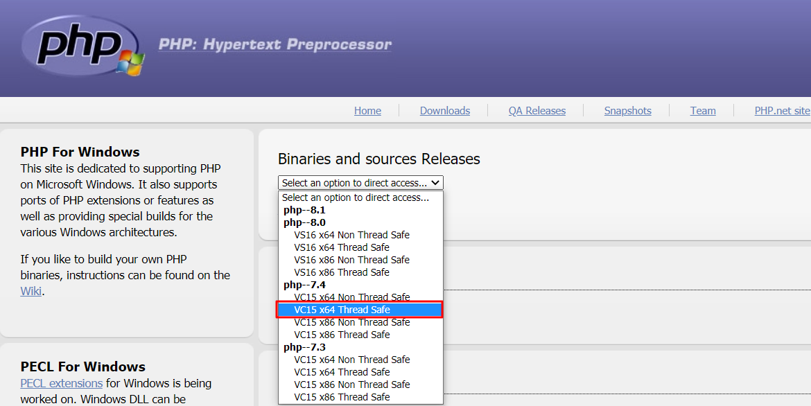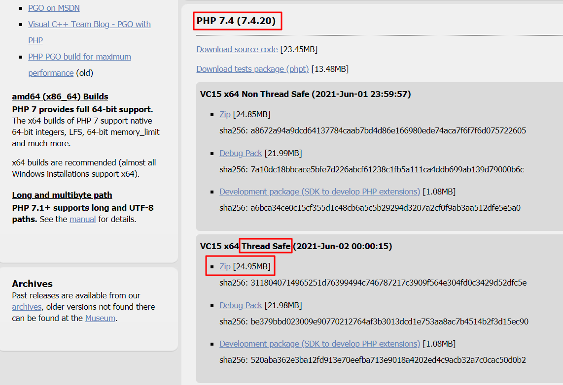 STEP 1) 윈도우용 PHP 배포 사이트에 접속하여 php 7의 최신 버전 파일을 다운로드 합니다.