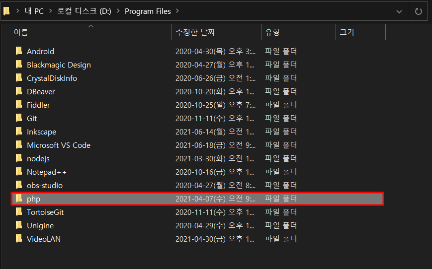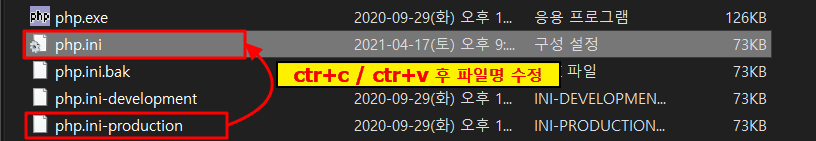 D:/Program Files/php 폴더의 php.ini-production 파일을 동일 폴더에 복사
