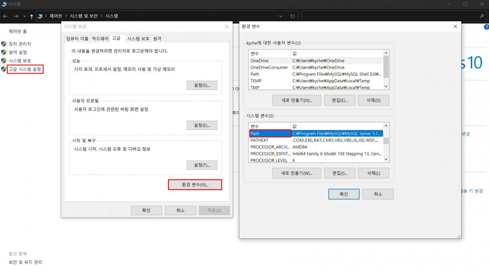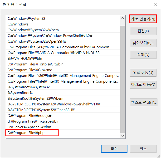 STEP 5) 환경설정을 마쳤으면 윈도우 시스템 환경 변수의 시스템 변수 path 에 php 실행파일 경로를 추가합니다.