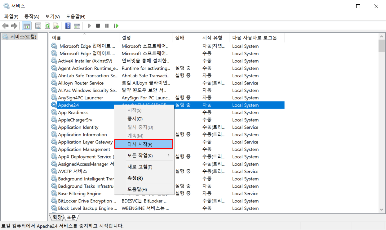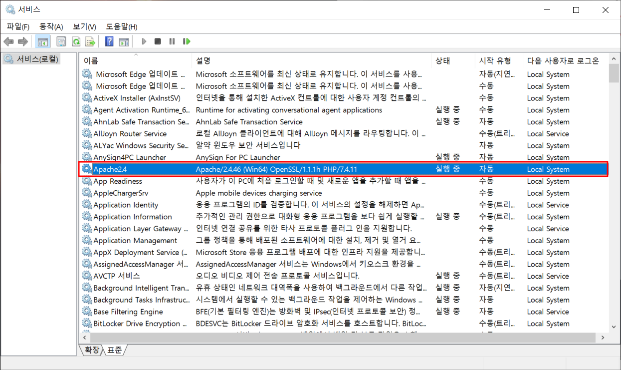 apache 서비스 항목에 php 관련 표시 내용 확인