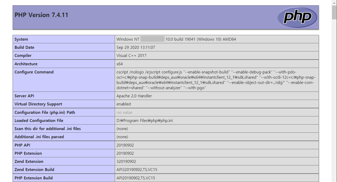 브라우저 주소창에 localhost/phpinfo.php 입력 후 아래와 같이 출력되면 php 정상 동작 확인 완료