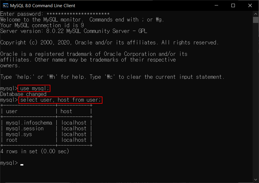 STEP 3) MySQL CLC에서 새로 생성한 계정으로 DB 서버에 접속합니다.
