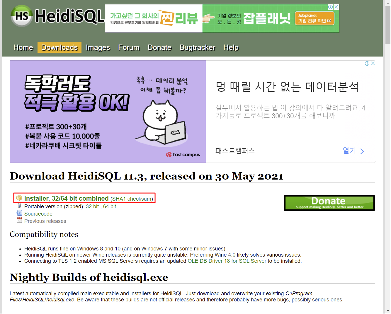 HeidiSQL 다운로드 페이지에 접속하여 최신버전을 다운로드 합니다.