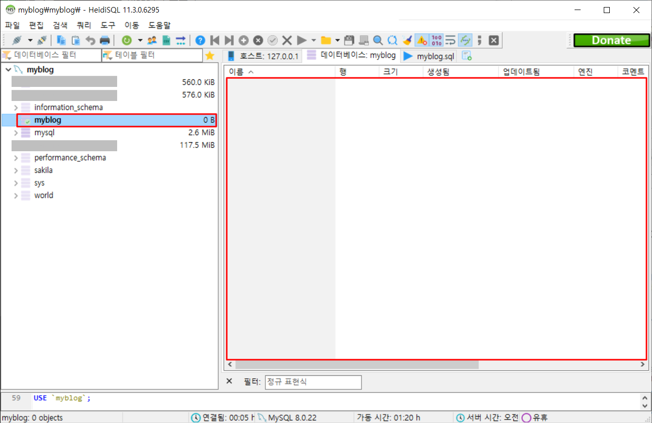 접속 후 블로그에서 사용하기 위해 생성한 DB 확인