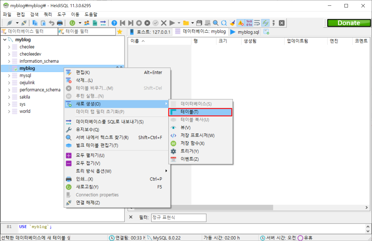 STEP 1) DB를 선택하여 마우스 우클릭 > 새로 생성(O) > 테이블(T)을 선택합니다.