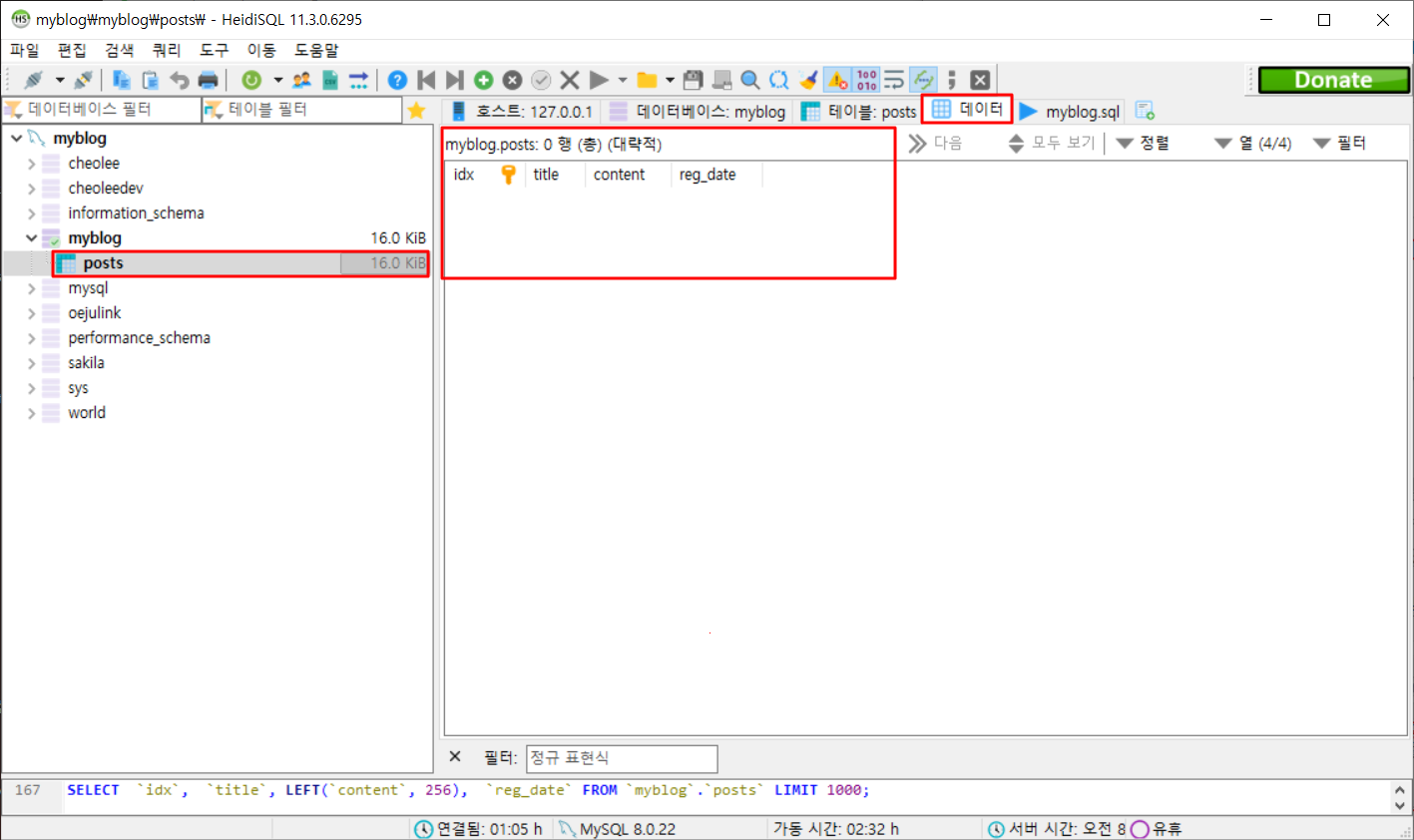 STEP 3) 아래와 같이 'myblog' 아래에 'posts' 라는 테이블 항목이 생성되었습니다.